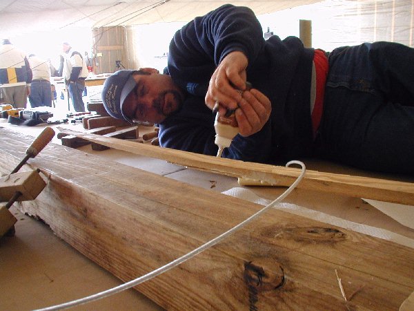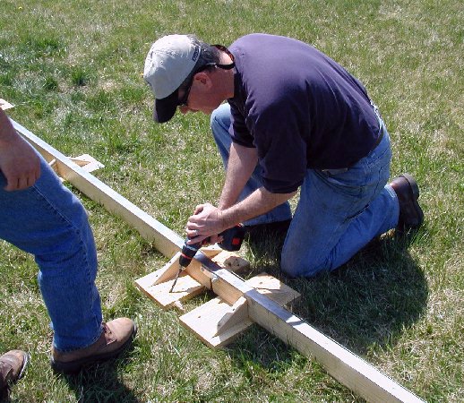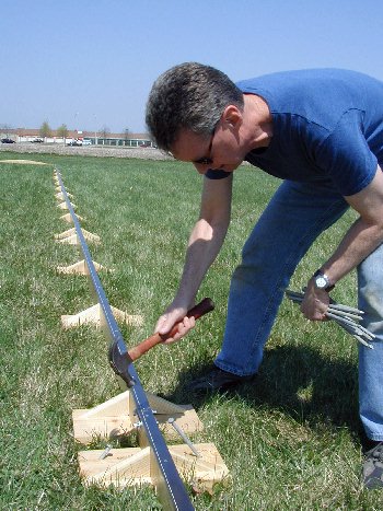 ![]() 18. Mike Perry, who constructed the launch rail, drills holes into the base for spikes. |
