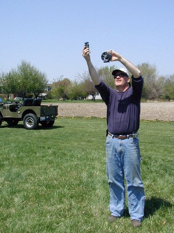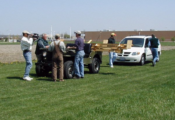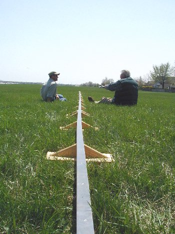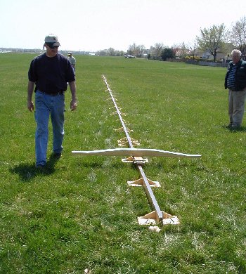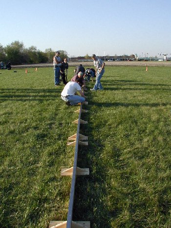![]() 16. Meanwhile at the grass runway parallel to the concrete runway another part of the team brings out the launch rail. Our friendly History Channel production crew joined us to videotape the rail assembly. |