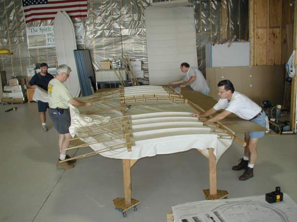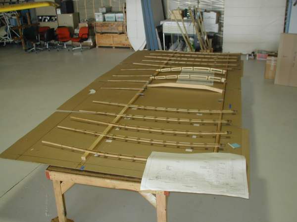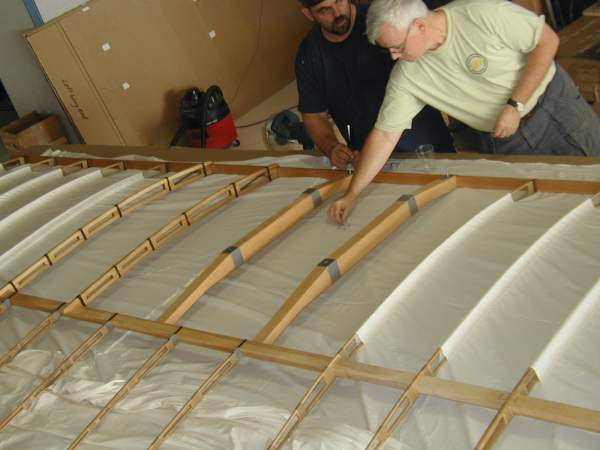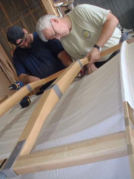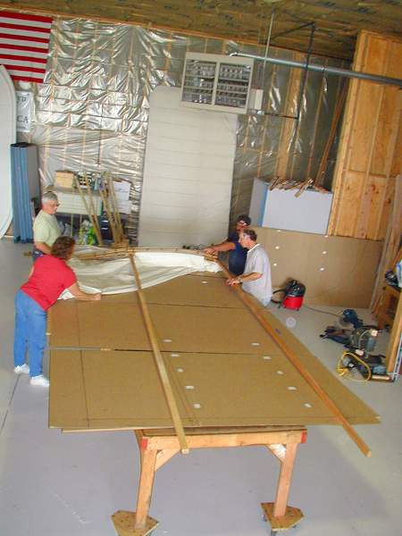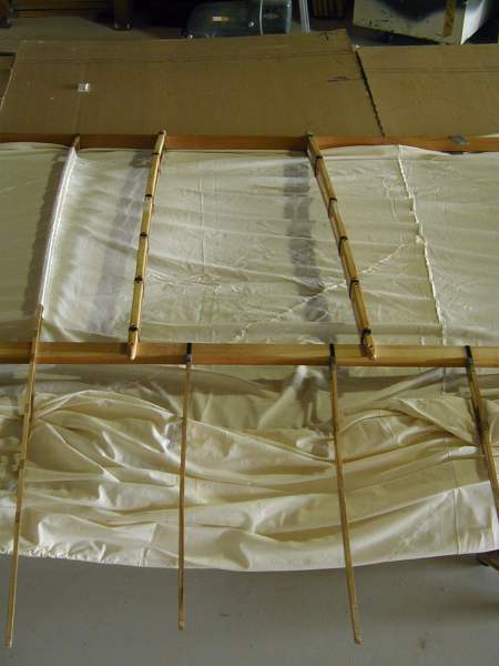 ![]() 8. Assembly begins on the ribs, fabric and spars. |