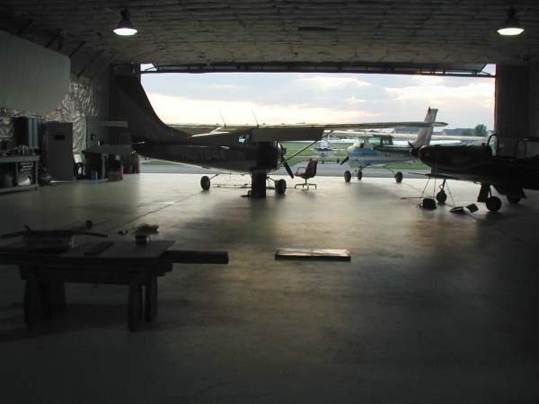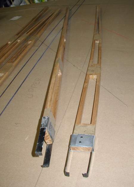 ![]() 3. Ribs of the lower center section are placed temporarily on the spars. At the right is the forward spar at the leading edge. And at the left is the aft spar, near the trailing edge. The large ribs carry the pilot's weight and the engine. |