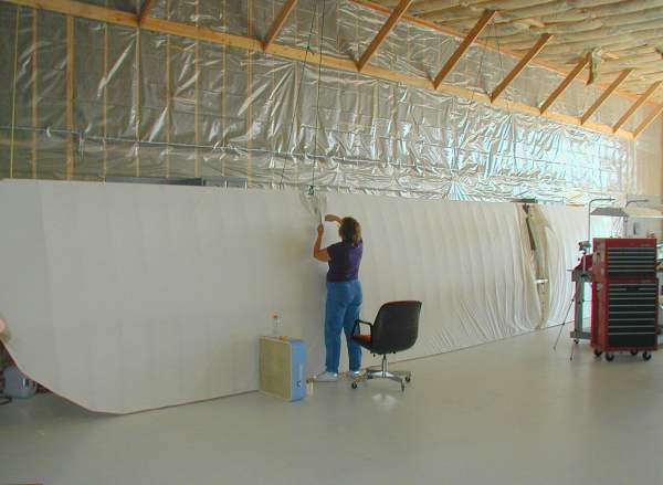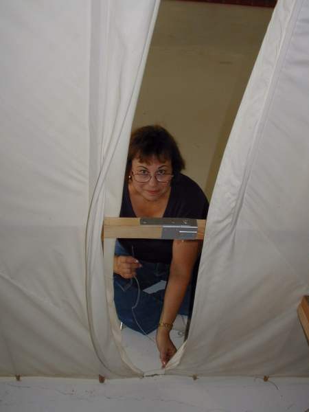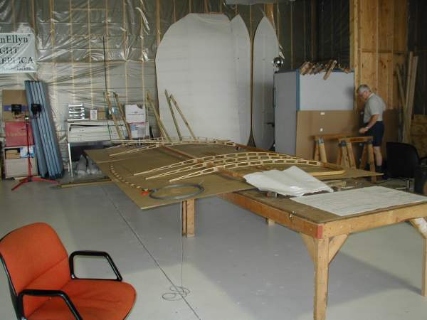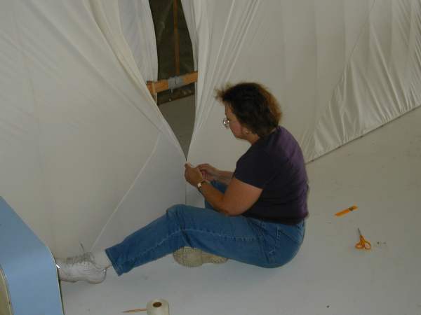 Today Jean worked hard all day stitching seams where each of the three wing sections joins together. The other crew members began assembly of lower wing section. |
