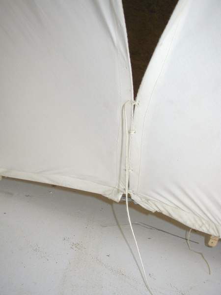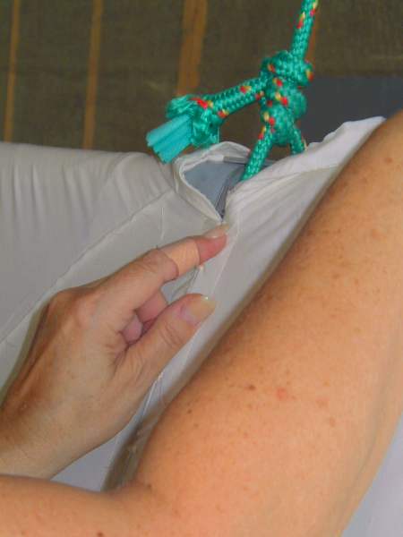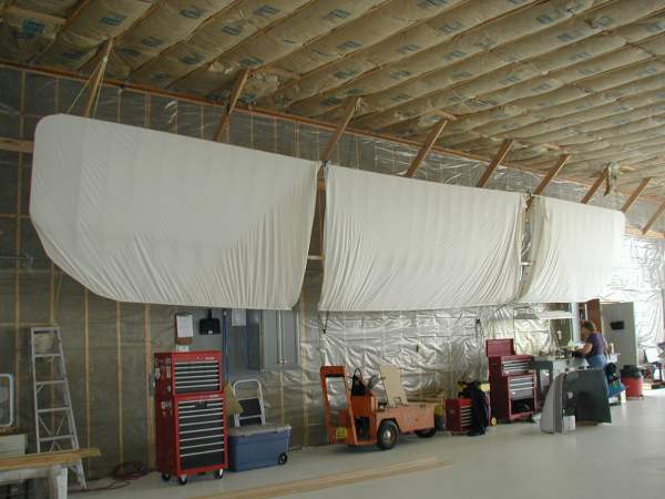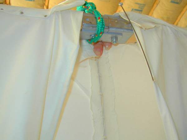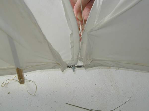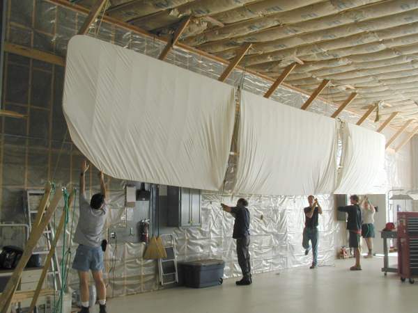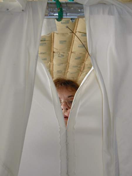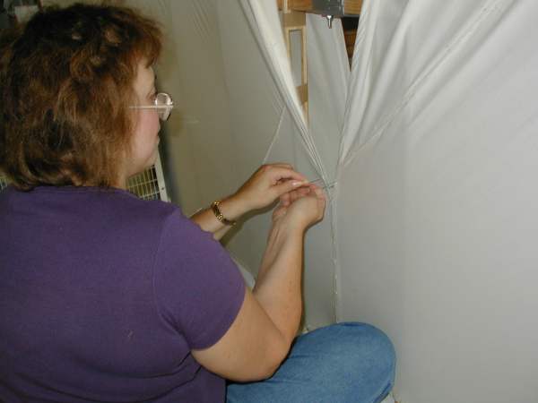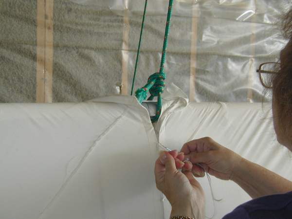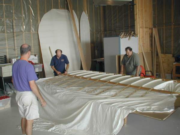 ![]() 7. We lowered the assembled upper wing from storage so Jean could hand stitch the two open seams. |