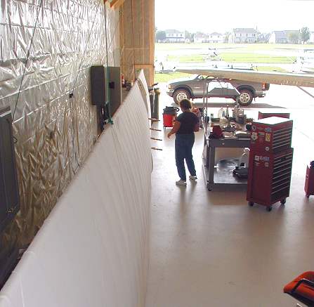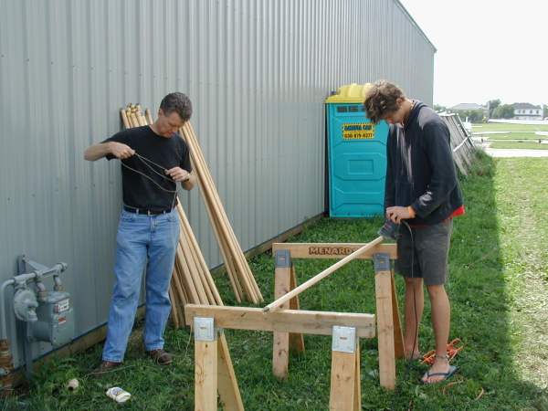 ![]() 6. Meanwhile Tom and his son are next to the hangar sanding and repairing struts. Notice the porta potty in the background? Mark had the vision to rent one since it's a long walk to Home Depot's restrooms. |