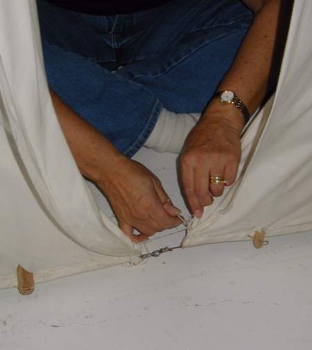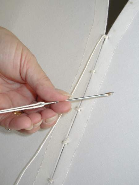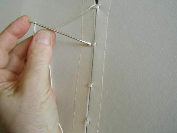 ![]() 9. Here's she is with needle and string, starting the first stitch. |