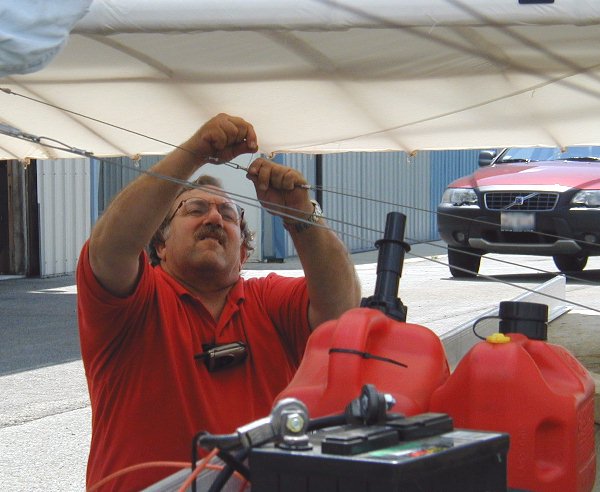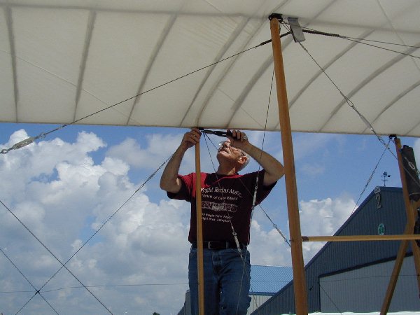 ![]() 2. Jim Wright safety wires a pair of the rigging wires. |