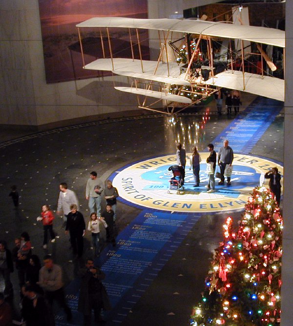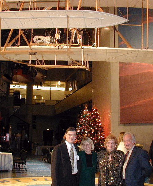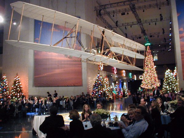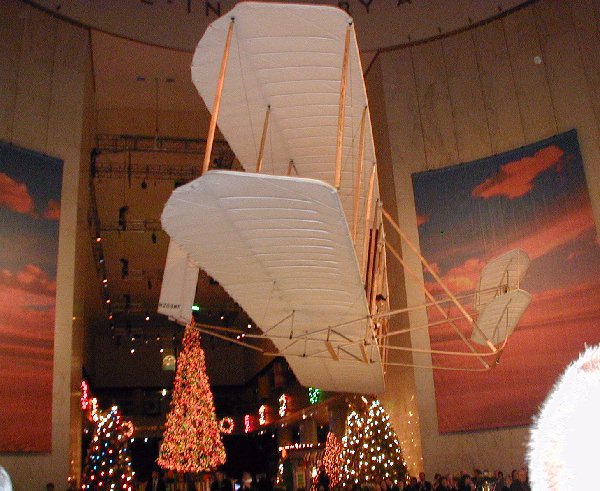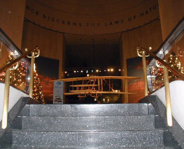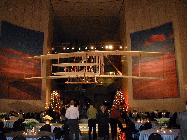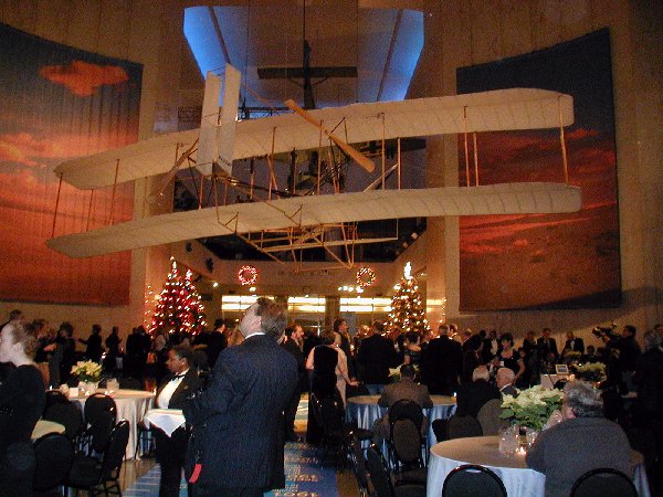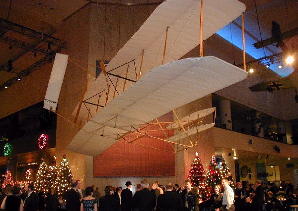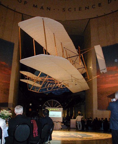 On this day the Wright Redux Association honors Orville and Wilbur Wright for giving birth to flight by formally presenting the 1903 Wright Flyer replica "Spirit of Glen Ellyn' to Chicago Museum of Science and industry. MSI in turn graciously gave to us and our major contributors a wonderful celebratory thank-you party which took place in the museum's rotunda. The rotunda is the circular portion of the museum through which everyone passes who enters the building. The rotunda is also the location where the "Spirit of Glen Ellyn" was hung from the ceiling for display. Kurt Haunfelner, vice president of exhibits and collections, positioned the aircraft in such a manner as to allow the Orville figure to gaze at those entering the hall. The first image shows the display upon entry. |
