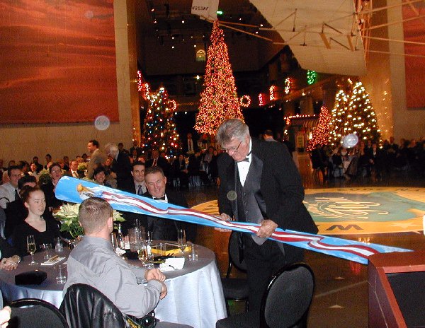 12. Dr. Ken Packer was presented by Mark Miller with a replica prop covered a very special paint scheme. |
