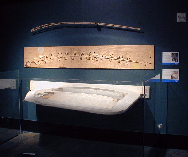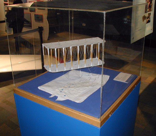 14. In one of the museum's exhibits, artifacts of construction are displayed. It includes a replica of the ribs used in construction. Below it is the actual jig (built by Mark Miller) used to assemble the ribs. Below the jig is an exhibit of a wing tip displaying the materials and parts used to assemble the wing. Clear plastic is used to view the inside of the wing. It was constructed by Jean and Bill Mumford. |