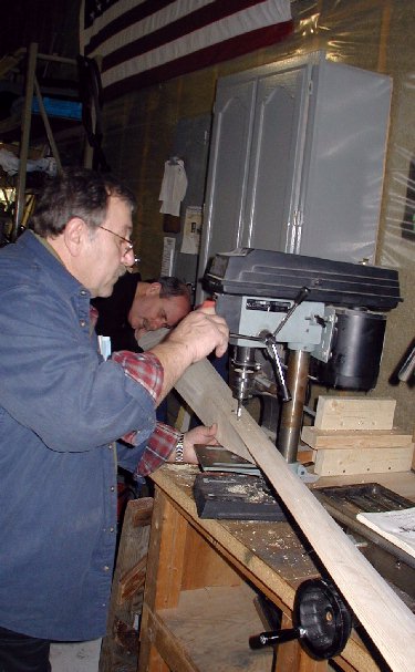 ![]() 3. Turk Tilev and Mike Perry carefully drill the screw holes into the prop hub. |