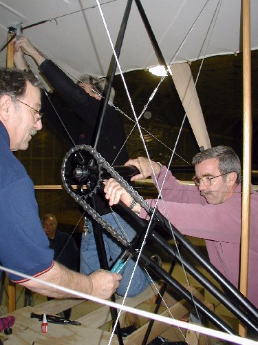 ![]() 8. Turk and Mike Gillian ensure chains, tubes and sprockets are securely mounted. |