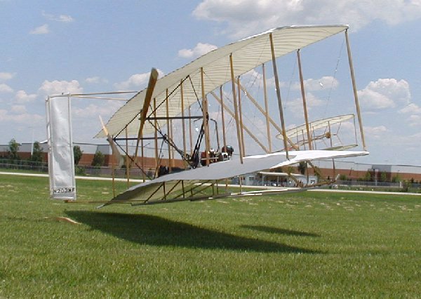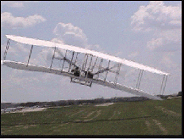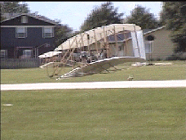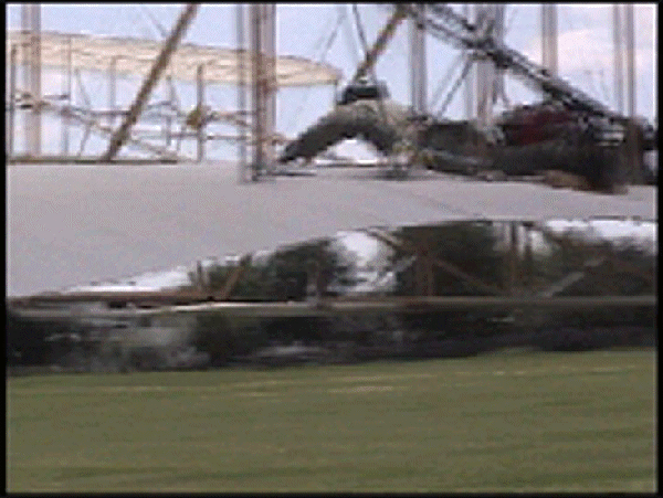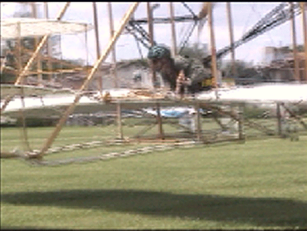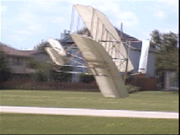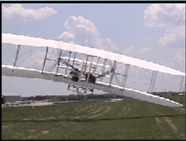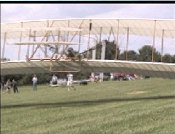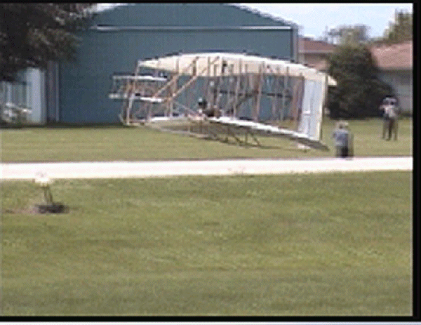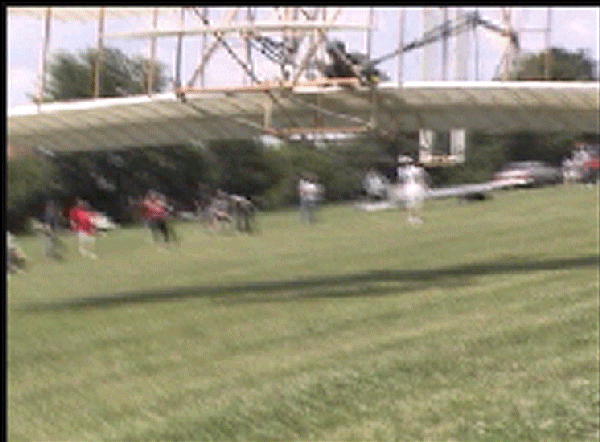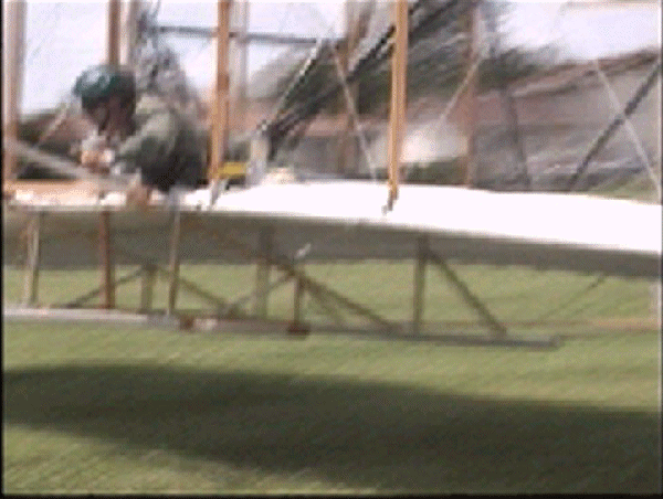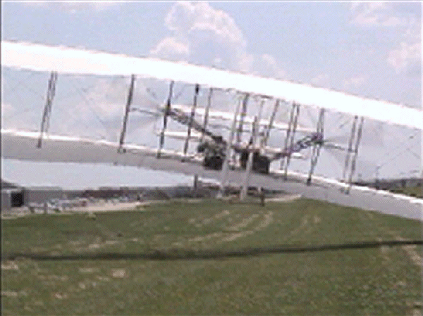 The Wright Redux Association flew the "Spirit of Glen Ellyn" once again. Pilot Mike Gillian pilots this flight to some 357 feet at about 15 feet altitude. Congratulations to Mike and crew! The first photo was taken with a digital still camera. The remainder were taken from portions of a video camera shot by Ken Lapi and Walt Wiborg. Thanks guys. |