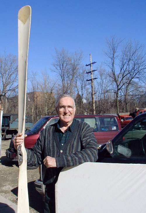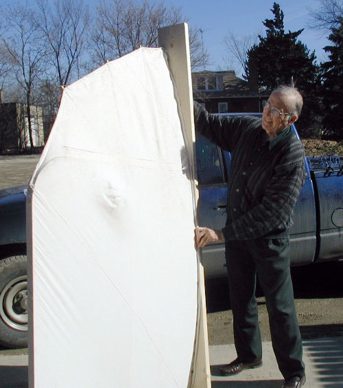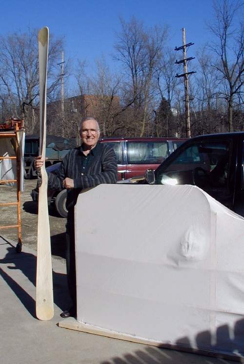 Ron Siebens retired airline pilot and neighbor from across the street of Miller's shop, drops by to see what we're up to. He asked to have his picture taken with the mock wing that the Mumford's made. He also displays the prop that Mark carved. |