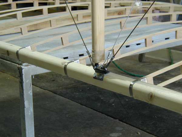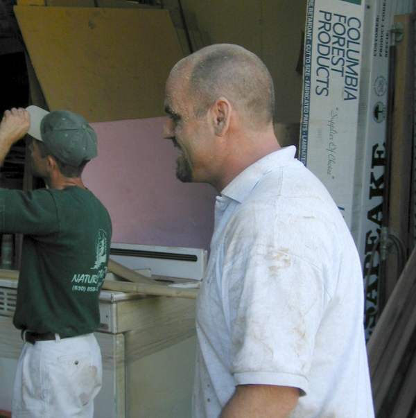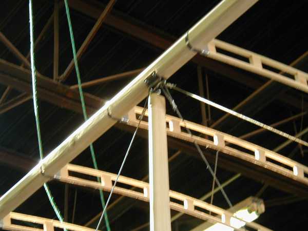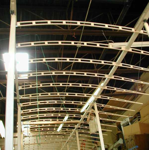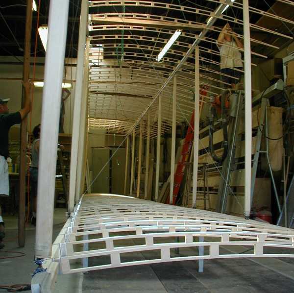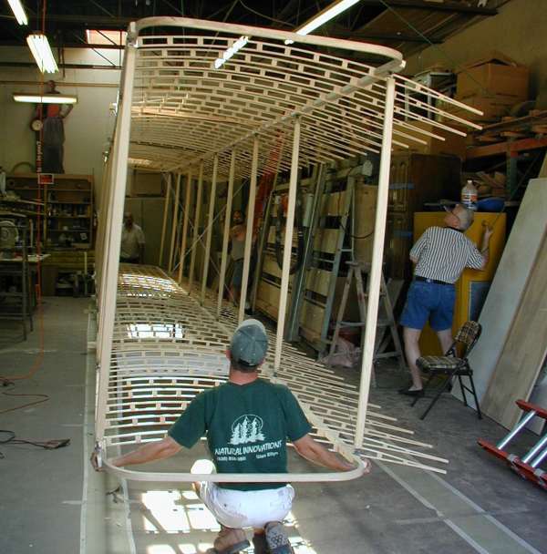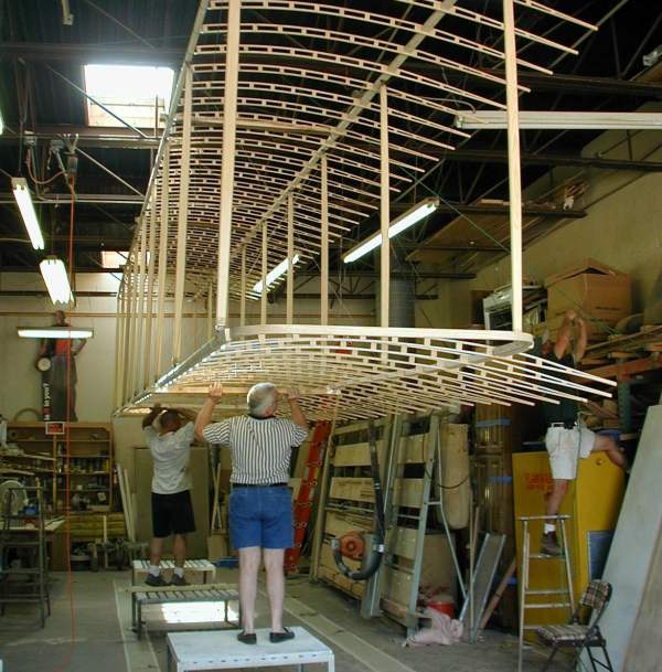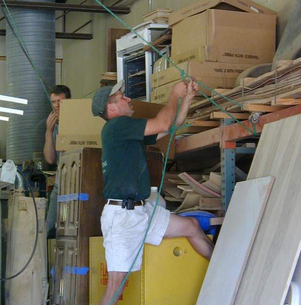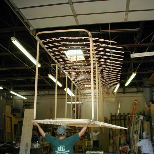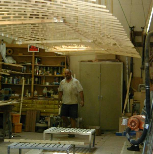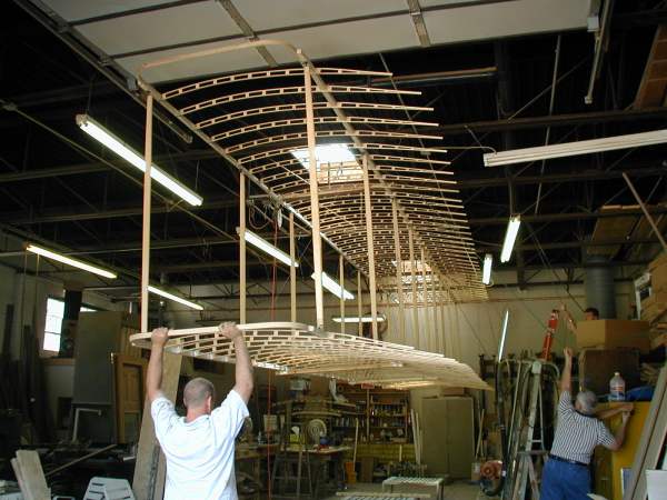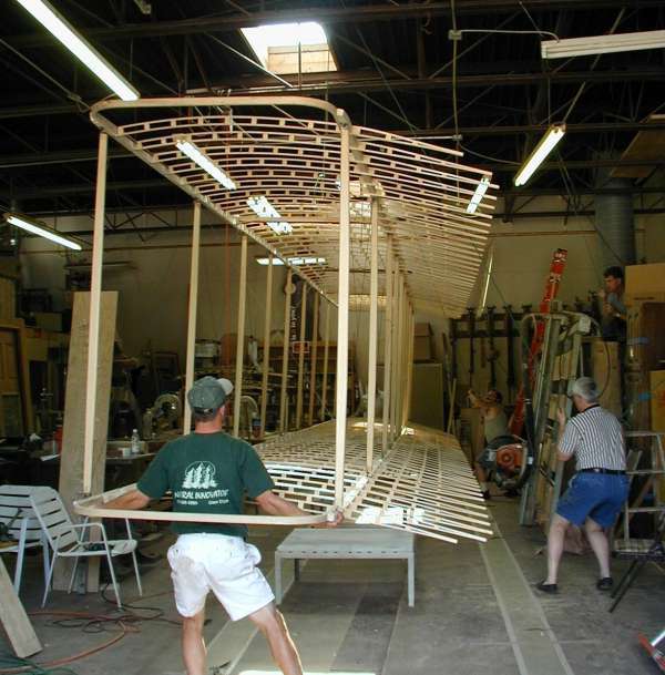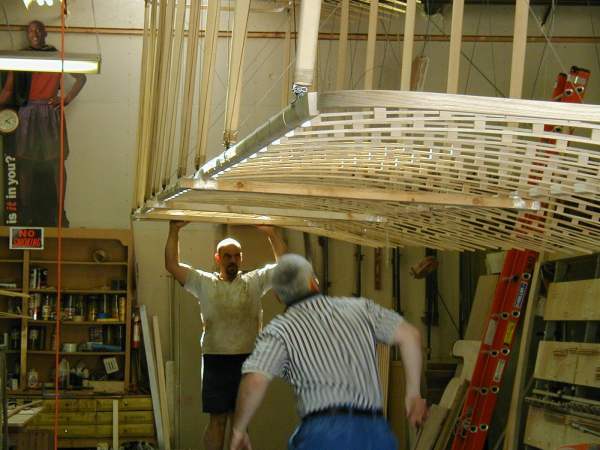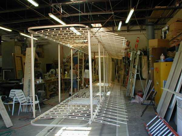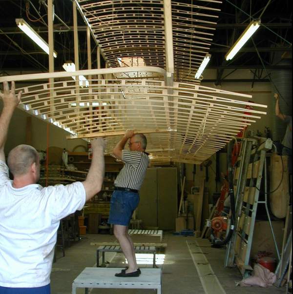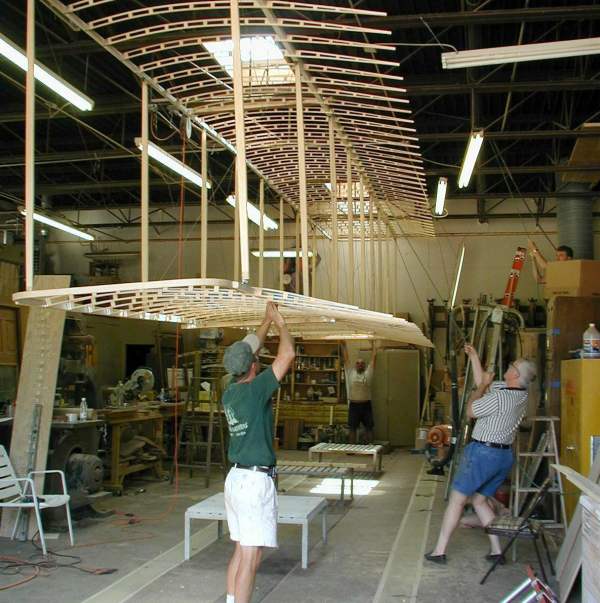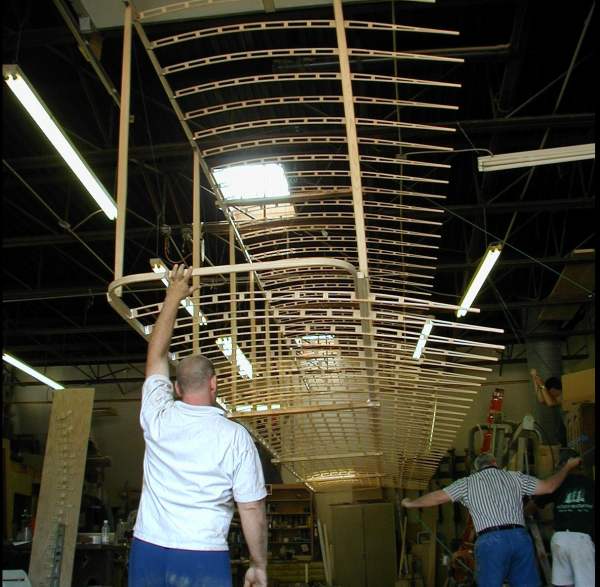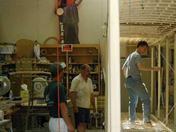 Mark, Tom, Ted and Ken hoist the Flyer wing cell prototype into the shop rafters for the first time, giving Mark room to work his business. My wife Peg and I were taking a walk this day and just happened to drop by the shop. And I just happen to have my camera with me. |