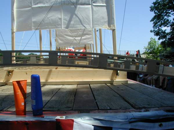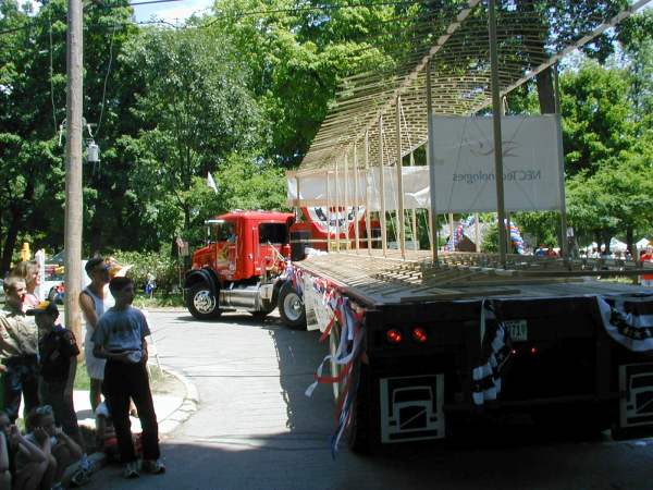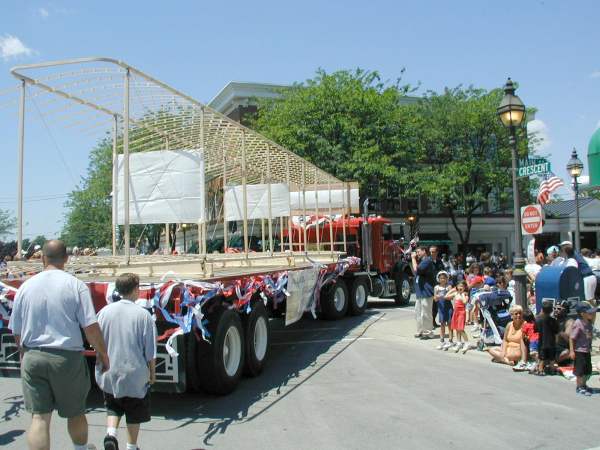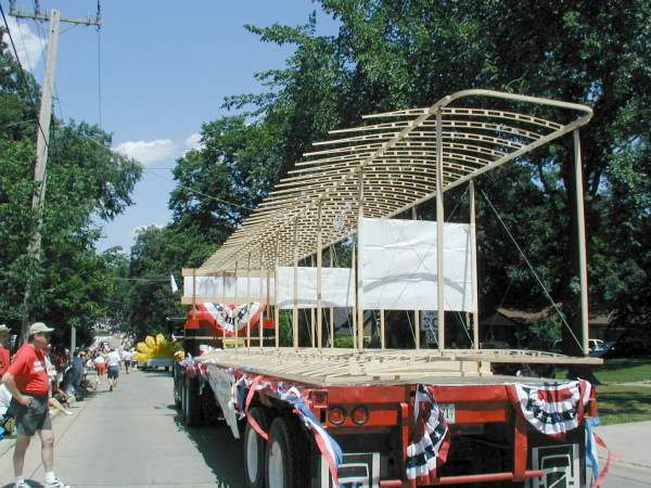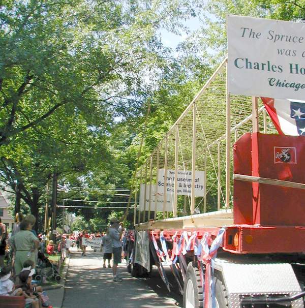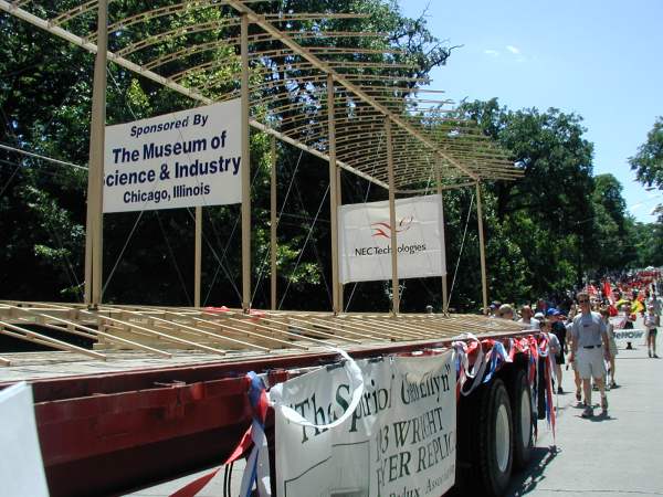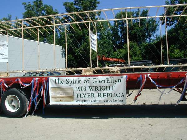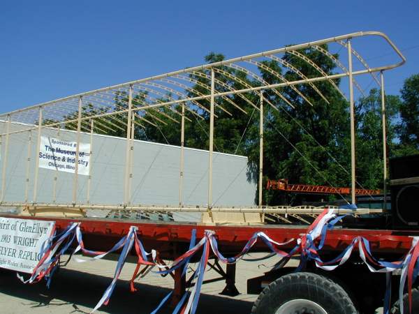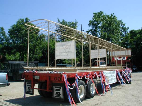 1. The wing cell of the Flyer is placed on a flatbed for the parade. |
