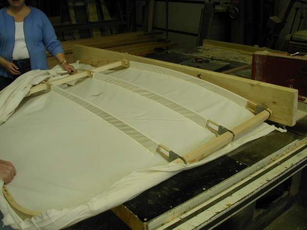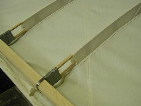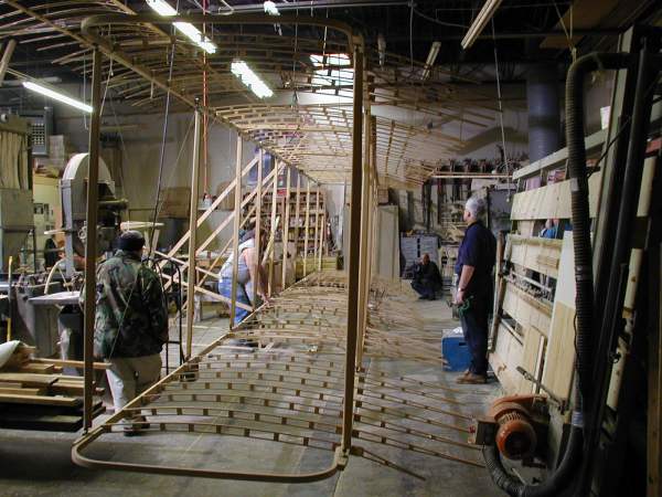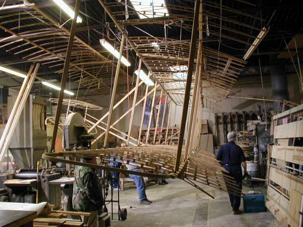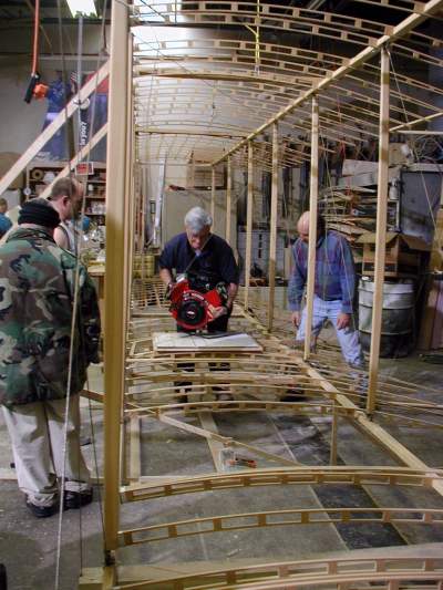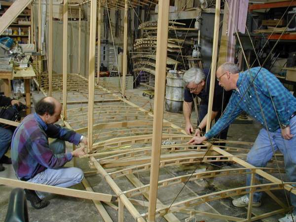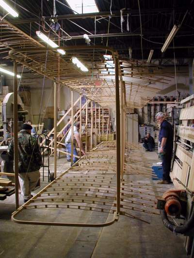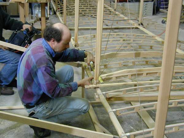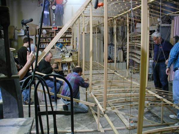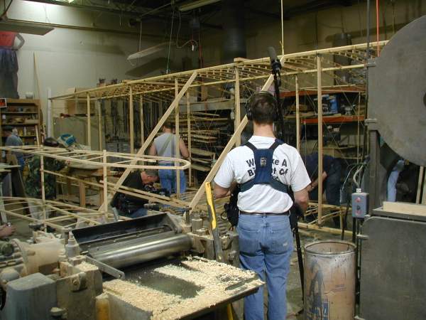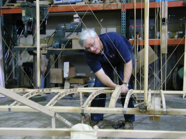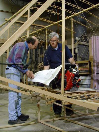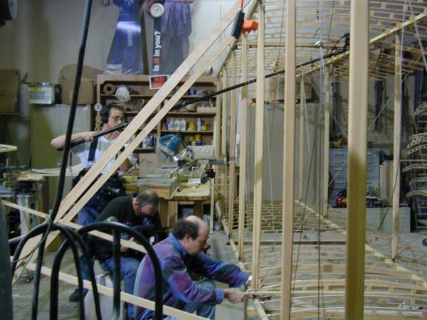 We work on the center section today as the National Geographic cameras record our progress. The wing mock-up is opened to show its construction. |