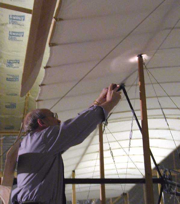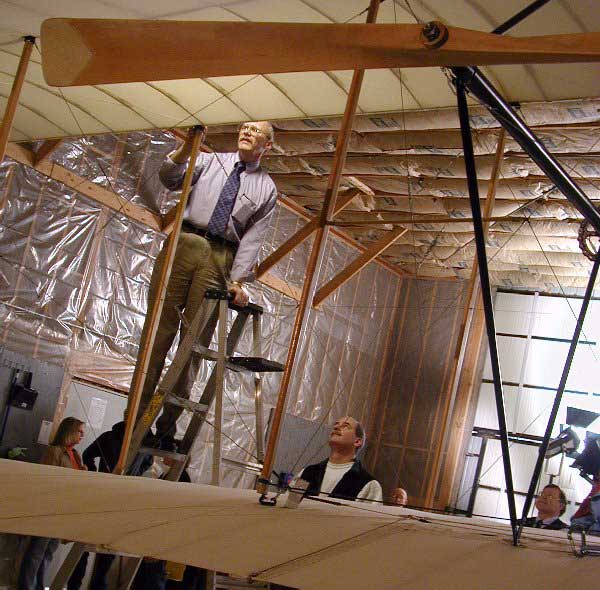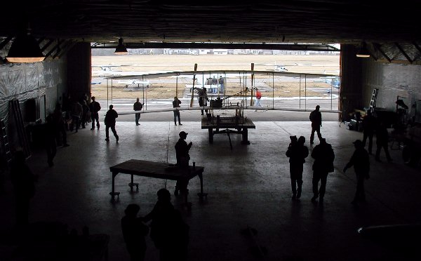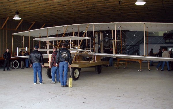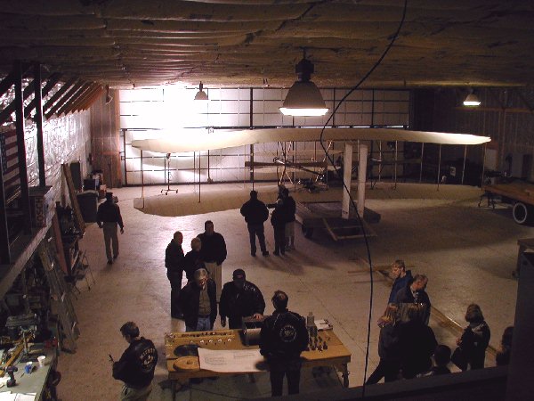 ![]() 1. The day started out like most others with visitors coming through the hangar to view our Wright Flyer replica. The exception to today's activities was that the Spirit of Glen Ellyn was about to be inspected by an FAA inspector for certification as the History Channel's cameras recorded event. |