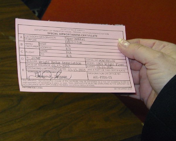 12. The Special Airworthiness Certificate in all its glory is viewed with pride by each team member. |