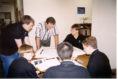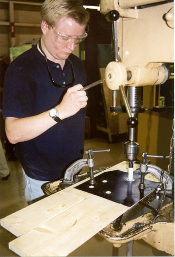 ![]() 7. Dennis Collins (Intern Teacher at P.E.) -- Dennis is drilling out the exhaust baffles. P.E. supports a program called Professional Resources - Industry Science and Mathmatics (PRISM). This program assists teachers in finding summer jobs in Industry so they can take their Industry experiences and knowledge back into the classroom. |