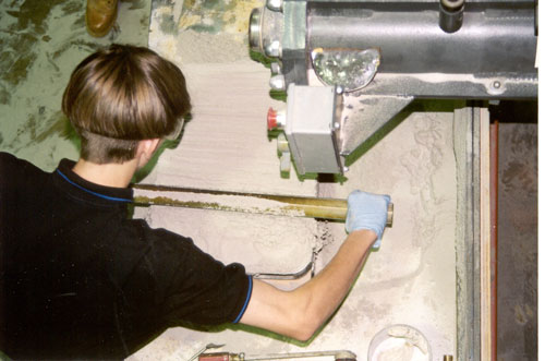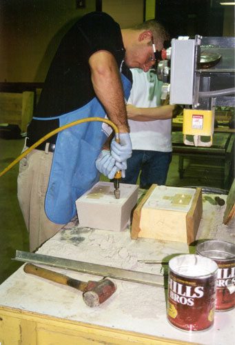 ![]() 13. Matt Jacobs (AFS) -- Matt is cutting the gating into the combustion chamber mold. |