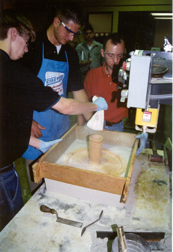 ![]() 14. Jamey Fenske (STEP), Matt Jacobs (AFS), Bogdan Perkowski (AFS) -- Matt and Bogdan are training Jamey on how to add the parting powder to the flywheel mold. |