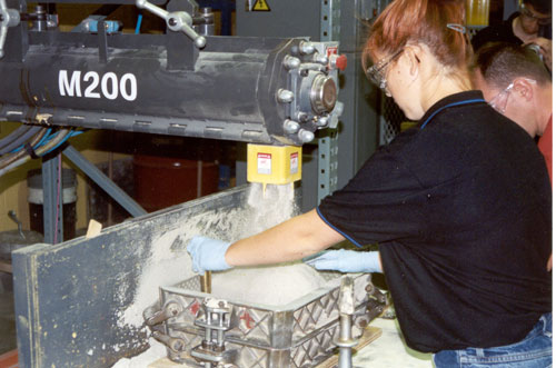 ![]() 26. Tina Kidwell (College Intern) -- Tina and John pouring the aluminum metal into the mold for the main & cam shaft bearing caps. |