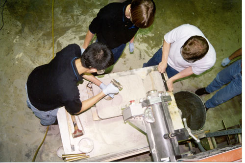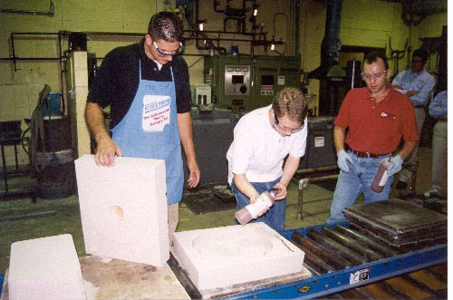 ![]() 18. Matt Jacobs (AFS); Patrick McCormick (College Intern), Bogdan Perkowski (AFS) -- Patrick is sealing together the cope and drag halves of the molds while Matt and Bogdan observe. |