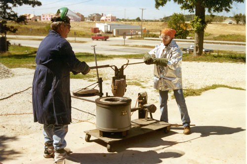 ![]() 25. John Kidd (P.E.) and Tina Kidwell (College Intern) -- John & Tina are taking the aluminum metal out of the gas fired furnace at Jim Packer's hobby foundry. |