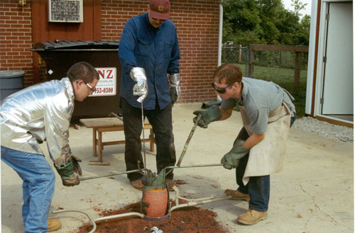 ![]() 22. Matt Jacobs (AFS) Bogdan Perkowski (AFS) and Kyioshi Martinez (STEP) -- Matt & Kyioshi pour the molten iron metal into the flywheel mold while Bogdan looks on. |