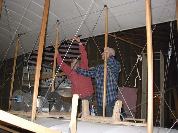 ![]() 4. Ted Craft and John Nowicki Jr. add more securing cables to the upper wing. |