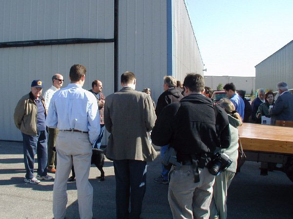 ![]() 2. Gathered outside the hangar the press, photographers, members of Wright Redux and Packer Engineering listen to Mark Miller and Dr. Ken Packer make their announcement. |
