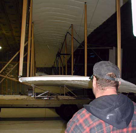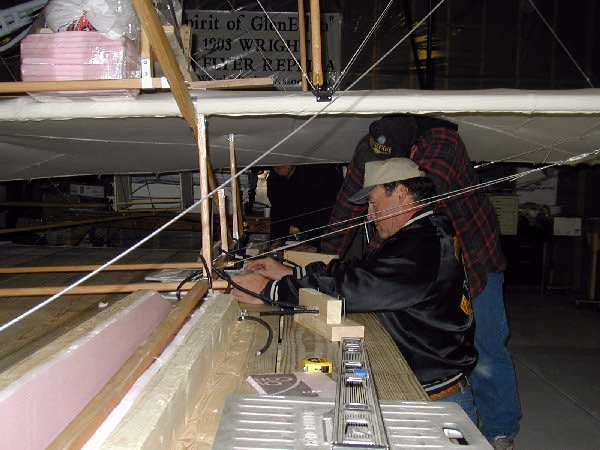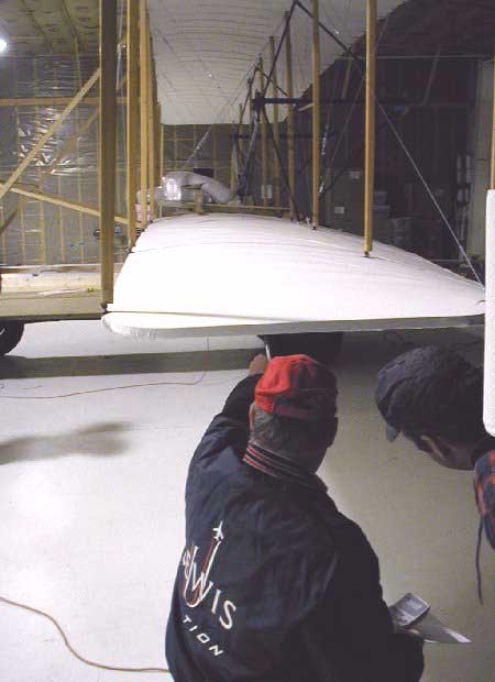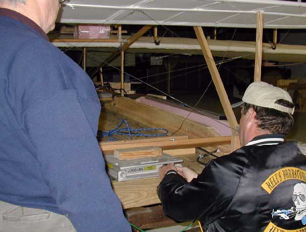 ![]() 2. John Nowicki and Mark Miller raise the aircraft and slip the left scale in place. |