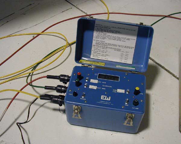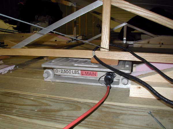 Today October 27, 2002, Ed Meyer weighed and balanced the Spirit of Glen Ellyn. The good news is she has a center of gravity dead-on to the crown of her wings. This is the best possible place for an aircraft's CG. The bad news? She's slightly over weight. But we have a good idea of the cause and plan to remedy that over the upcoming weeks. This series of photos shows the FAA approved scales, fiber optic cables, and calculating instrumentation and its placement for the measuring to take place. |