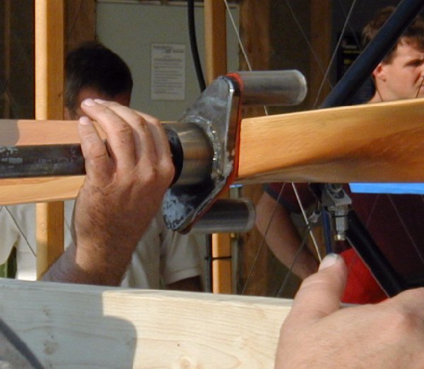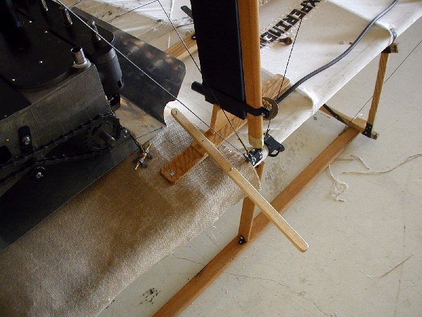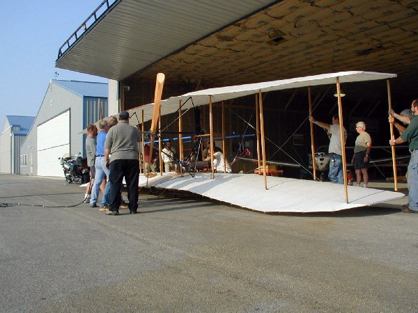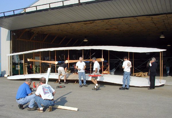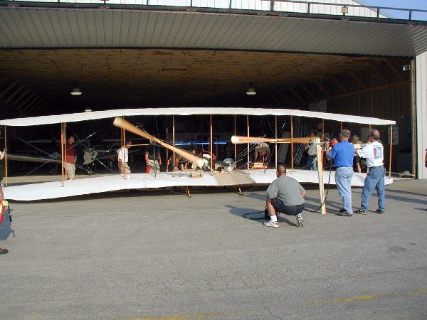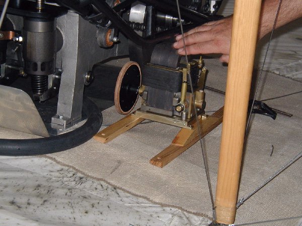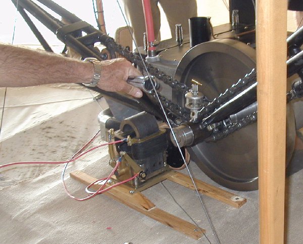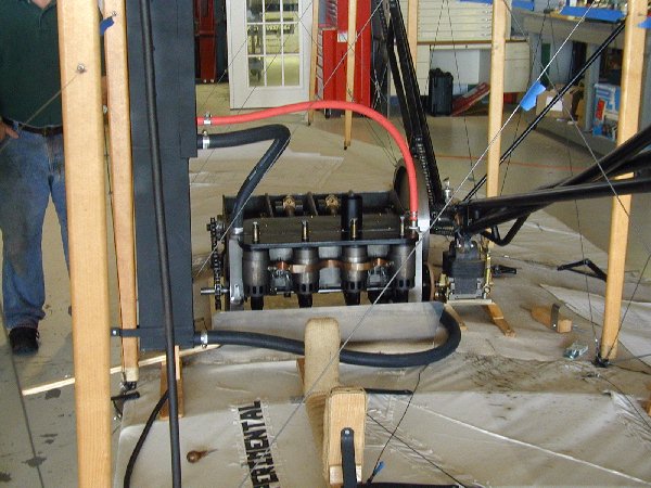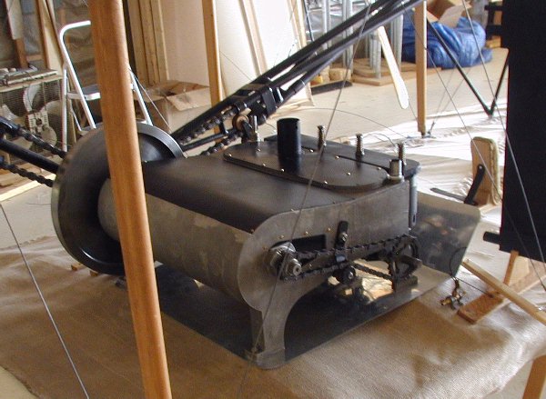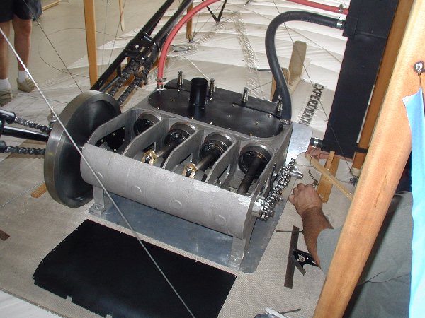 Wright Redux and Packer Wings crews start the replica engine on the airframe for the first time. The marriage was successful but for a minor glitch. The replica engine was mounted this weekend onto its permanent home atop the lower wing of the Flyer. For the sake of safety we decided to apply, onto the wing fabric, a flame retardant material beneath the engine. In addition a sheet metal shield was added for protection not only to the airframe but to deflect the exhaust blast away from the pilot. The blast shield caused us to reroute one of the water cooling hoses in a different location. And water was added to the system by way of the Flyer's radiator (more like a water tank). Much discussion was given to how we would start the Flyer's engine. One side of the house wanted to just hand start the props. The other side said that was much too dangerous and an alternative had to be found. Enter a pair of men who run race cars. (My apologies to them for not getting their names.) They brought in an externally applied, battery operated engine starter they use to start their race cars. The theory was great but we needed the proper coupling. Turk Tilev made a few measurements and ran off to his machine shop to fabricate the needed part. Within hours he returned with the perfect tool for the job. While he was gone our new best friends (the race car guys) mounted their starter motor onto a couple of two-by-fours. They needed the starter to be held at just the right height to apply the coupling onto the prop hub and to support the weight of the starter assembly. The Flyer's engine start-up problem was solved. We discussed our start-up procedure and who would be where doing what job. Then we did a dry run, which looked more like a pit-crew choreography. Confident that we were ready, the coupling and starter assembly were applied to the prop hub, and the start button pressed. The props were spun at just the right speed as the engine coughed to life. How wonderful it was to hear that beautiful replica engine come alive. It ran smoothly with the tone of an antique tractor engine that only a gearhead could appreciate. We all yelled for joy! Within about a minute of operation the spotters frantically motioned to shut it down. The right prop was out of sync with the left one. It was running slower. When all had stopped moving, we discovered the pin holding the prop onto the propshaft had sheared in two. It was a bittersweet moment. I'll bet Orville and Wilbur had days like this. |